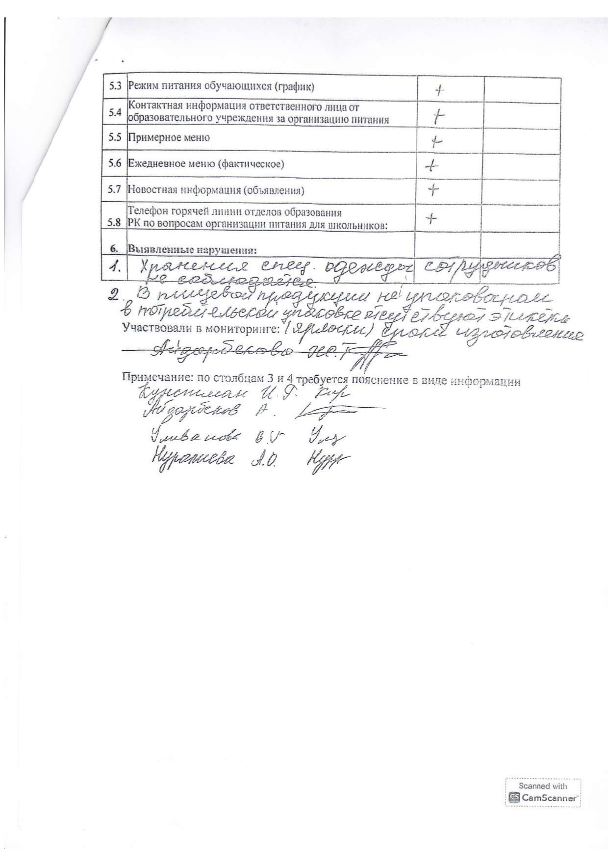 Мониторингтік комиссия мен ата-аналардың мектеп асханасын тексеру актісі/Акт №5 проверки школьной столовой мониторинговой комиссией и родителями